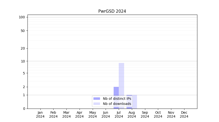 Number of downloads for experiment package PwrGSD, year by year, from 2025 back to 2014 (years with no downloads are omitted):