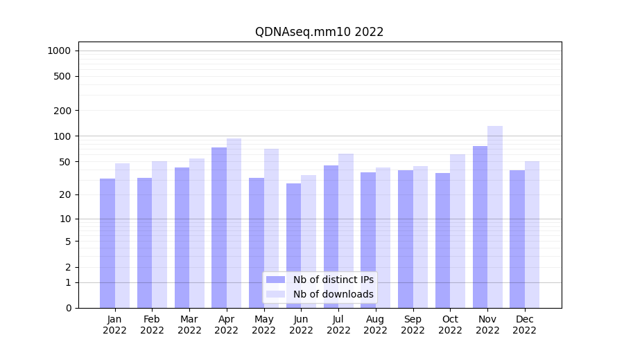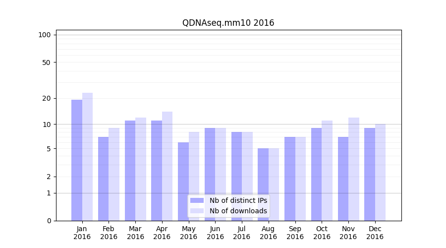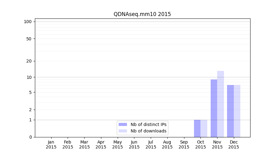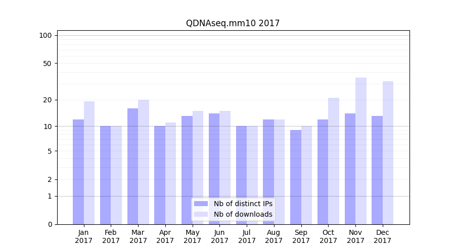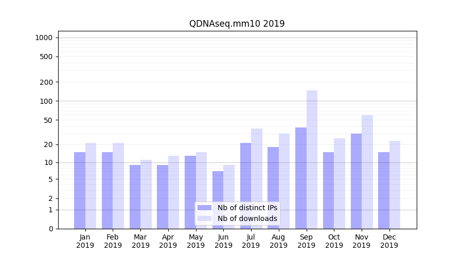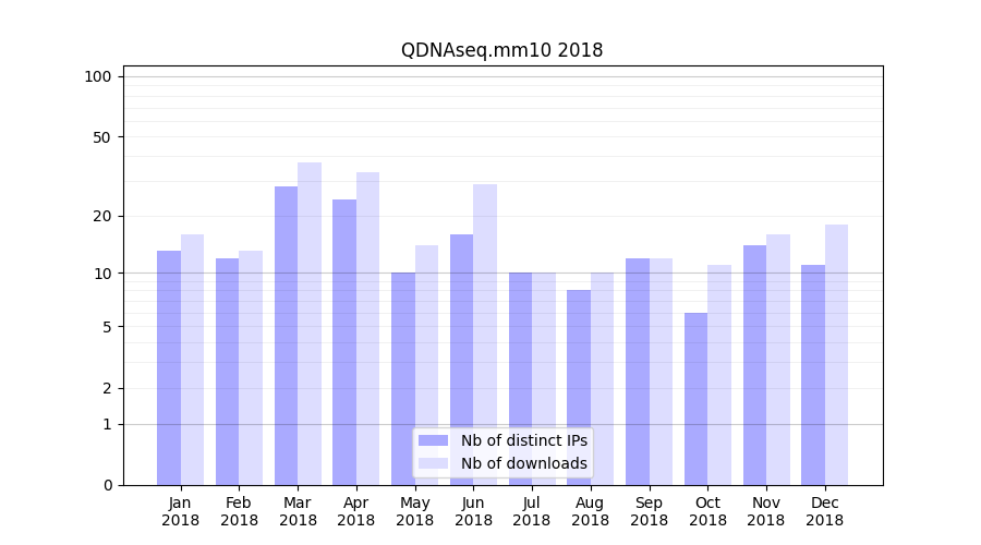 Number of downloads for experiment package QDNAseq.mm10, year by year, from 2025 back to 2014 (years with no downloads are omitted):
