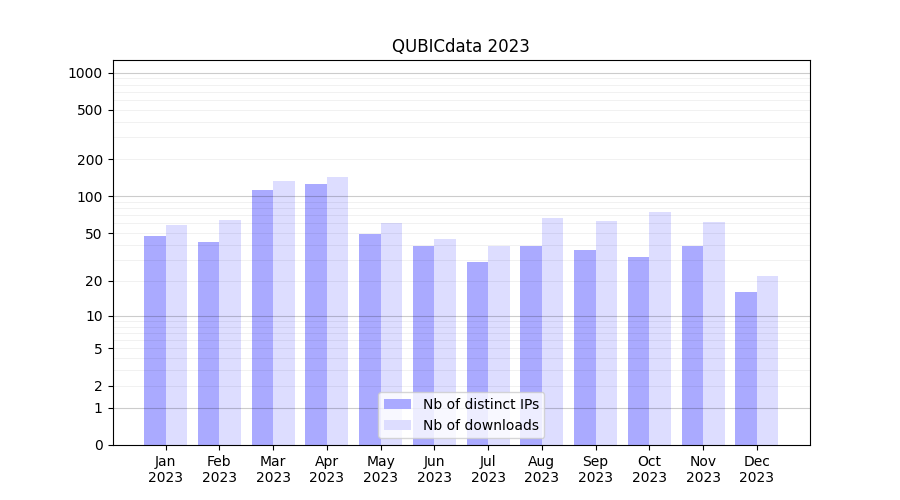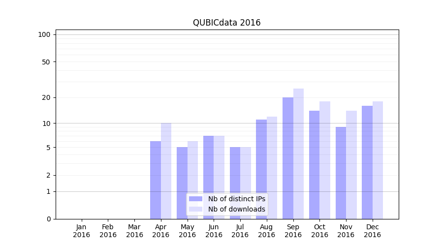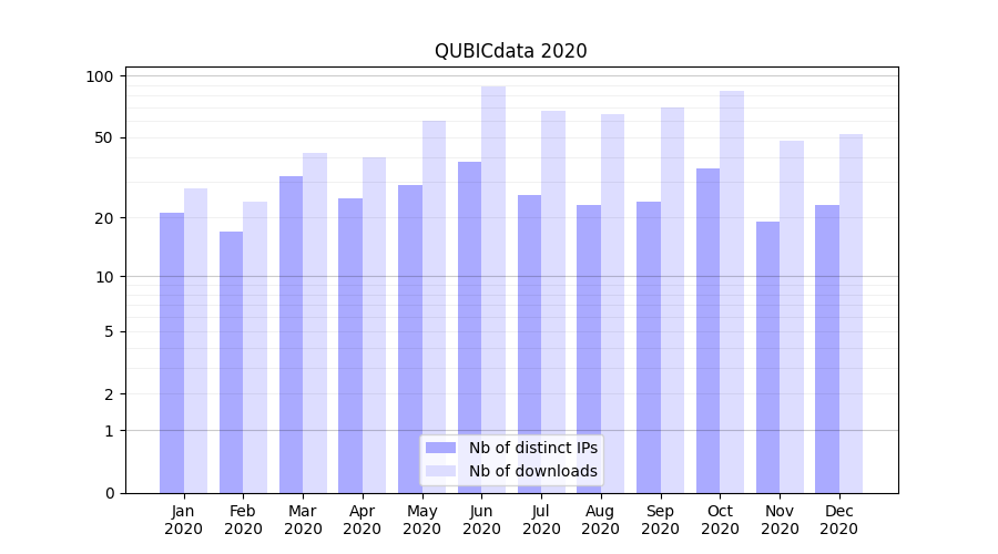 Number of downloads for experiment package QUBICdata, year by year, from 2025 back to 2014 (years with no downloads are omitted):