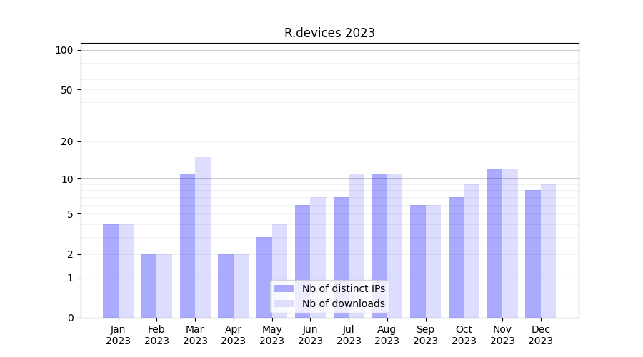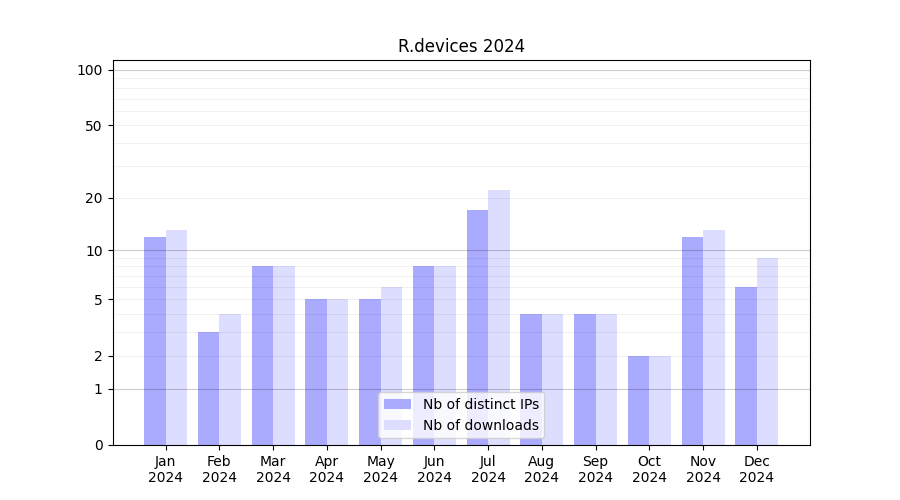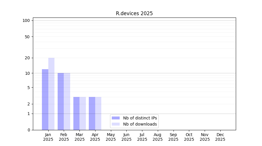 Number of downloads for experiment package R.devices, year by year, from 2025 back to 2014 (years with no downloads are omitted):