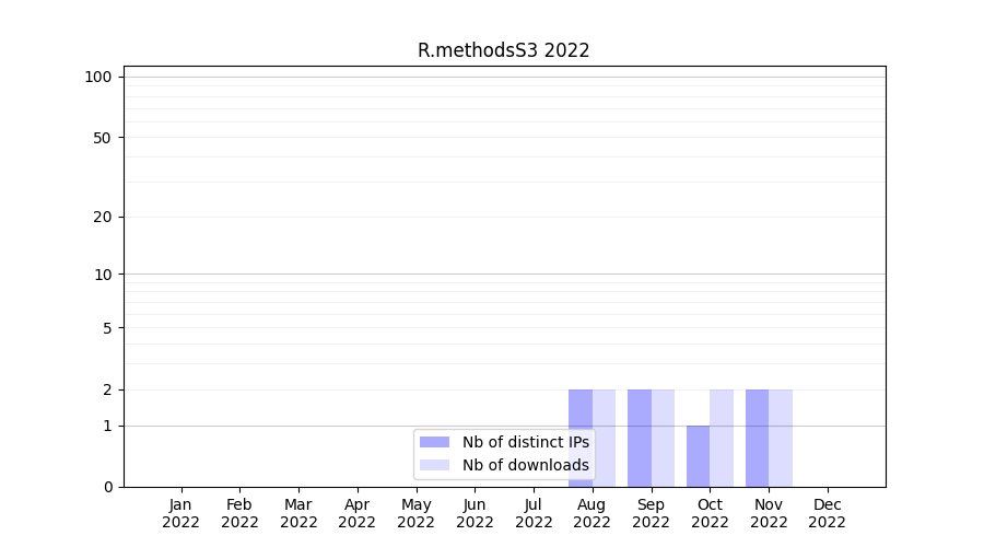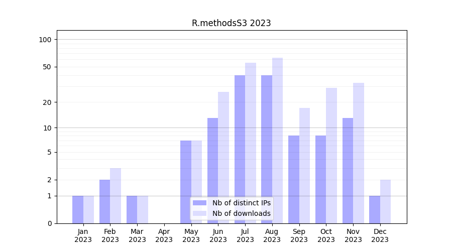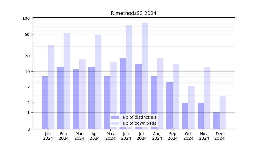 Number of downloads for experiment package R.methodsS3, year by year, from 2025 back to 2014 (years with no downloads are omitted):