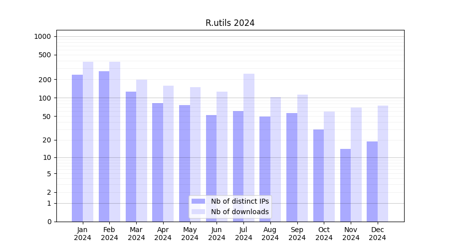 Number of downloads for experiment package R.utils, year by year, from 2025 back to 2014 (years with no downloads are omitted):