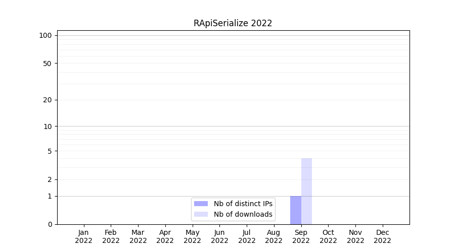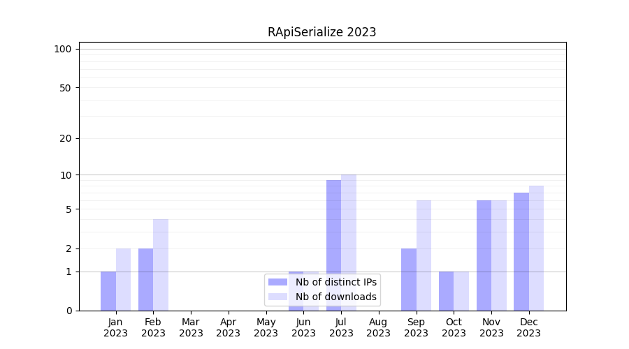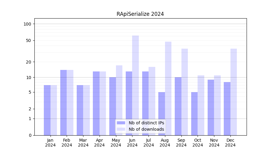 Number of downloads for experiment package RApiSerialize, year by year, from 2025 back to 2014 (years with no downloads are omitted):