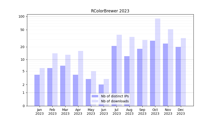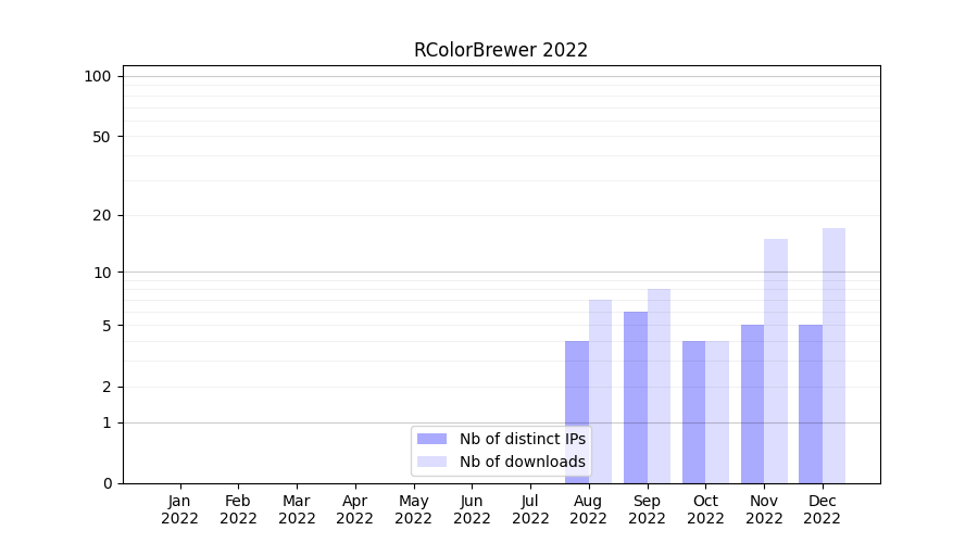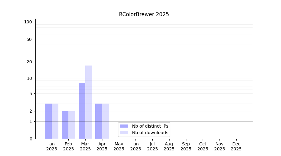 Number of downloads for experiment package RColorBrewer, year by year, from 2025 back to 2014 (years with no downloads are omitted):