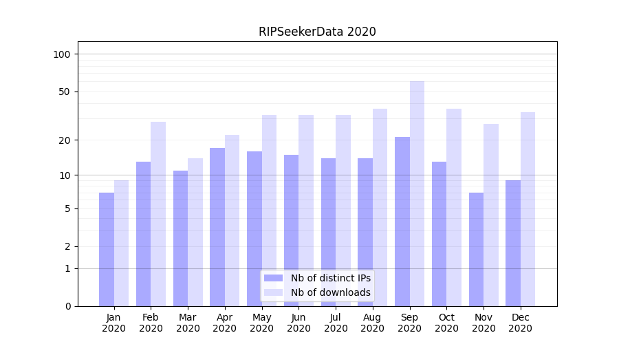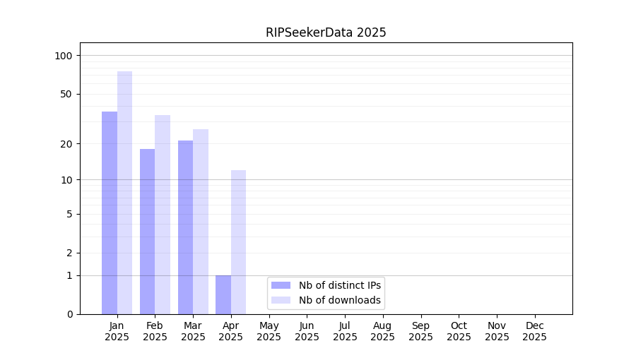 Number of downloads for experiment package RIPSeekerData, year by year, from 2025 back to 2014 (years with no downloads are omitted):