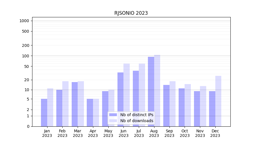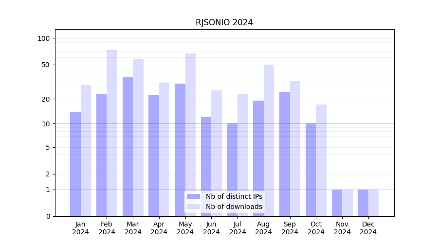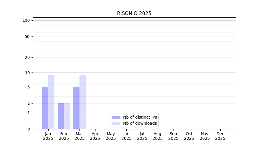 Number of downloads for experiment package RJSONIO, year by year, from 2025 back to 2014 (years with no downloads are omitted):