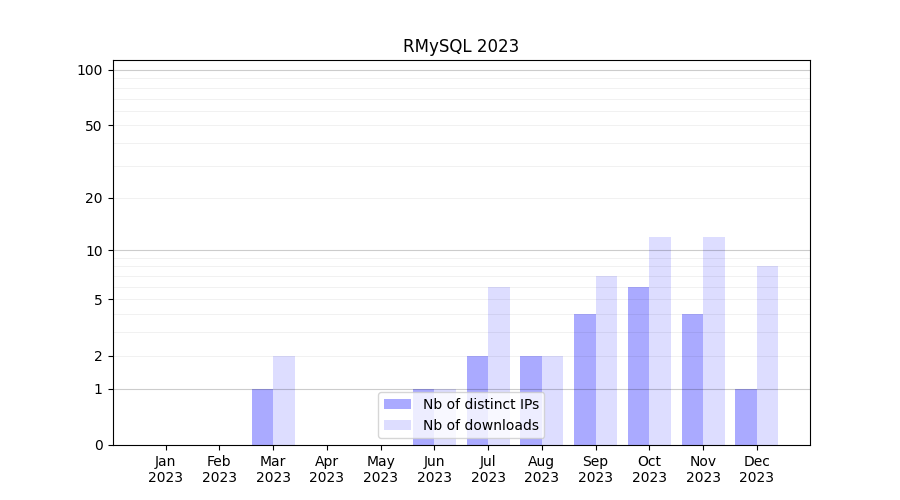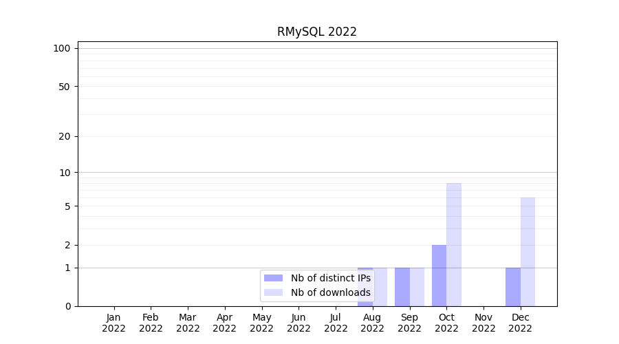 Number of downloads for experiment package RMySQL, year by year, from 2025 back to 2014 (years with no downloads are omitted):