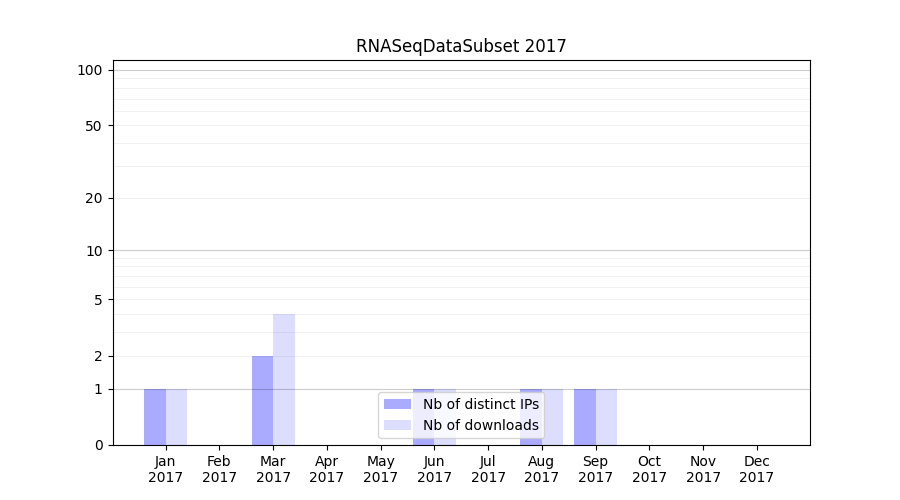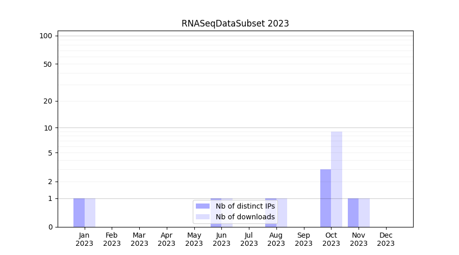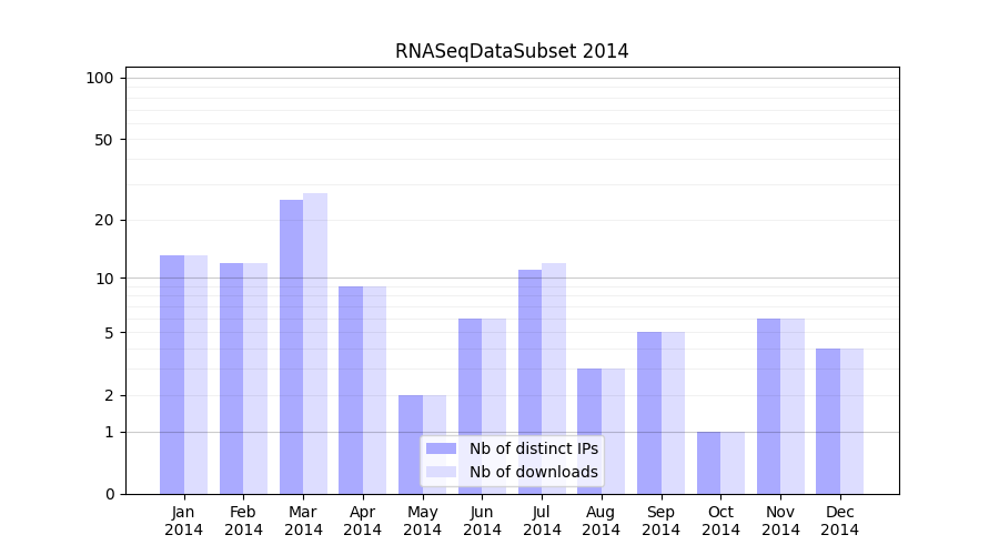 Number of downloads for experiment package RNASeqDataSubset, year by year, from 2025 back to 2014 (years with no downloads are omitted):