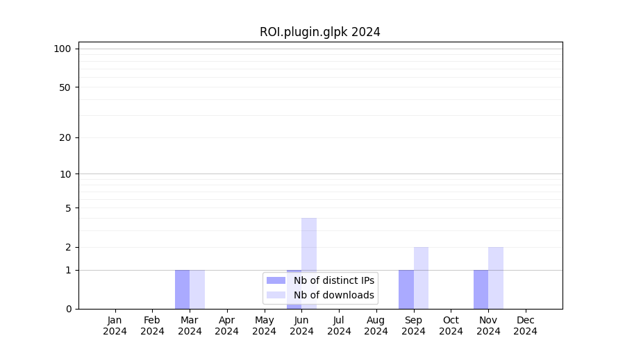 Number of downloads for experiment package ROI.plugin.glpk, year by year, from 2025 back to 2014 (years with no downloads are omitted):