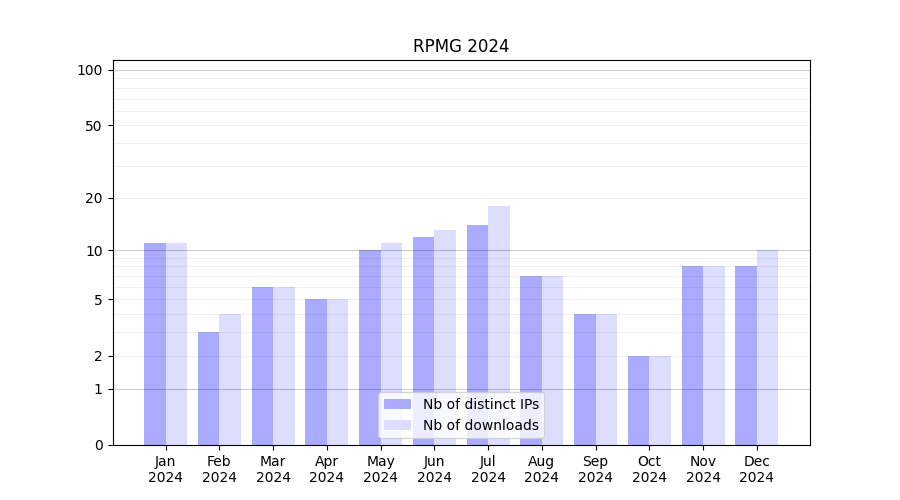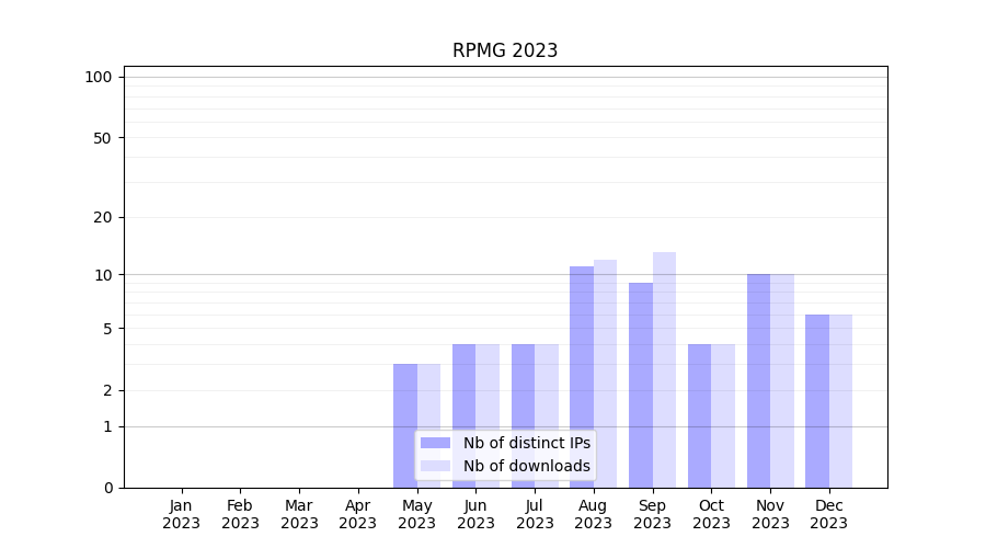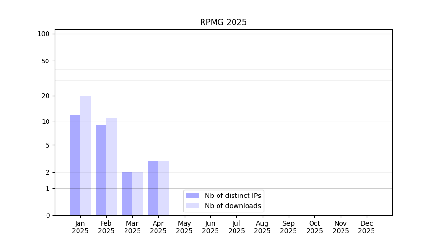 Number of downloads for experiment package RPMG, year by year, from 2025 back to 2014 (years with no downloads are omitted):