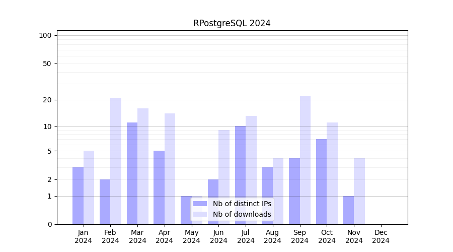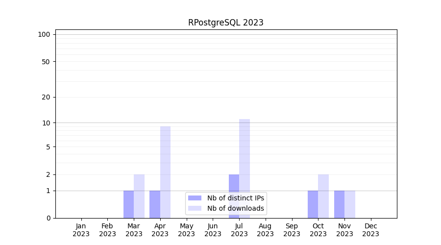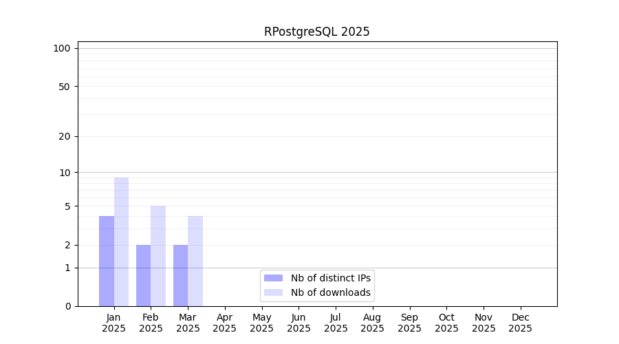 Number of downloads for experiment package RPostgreSQL, year by year, from 2025 back to 2014 (years with no downloads are omitted):