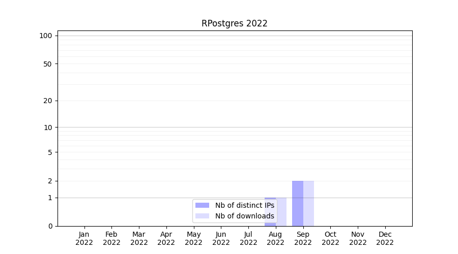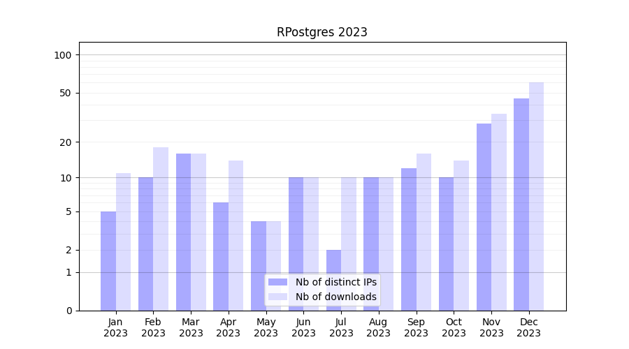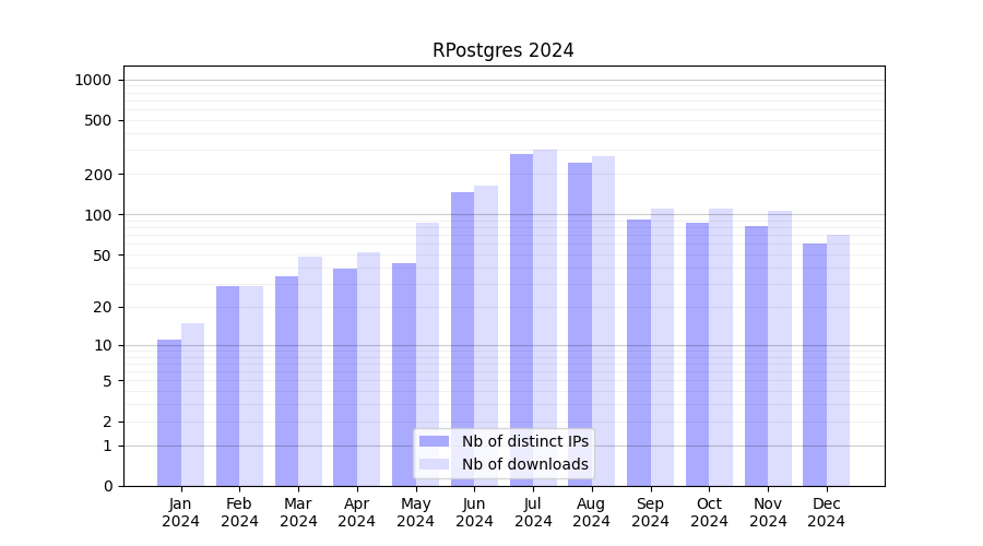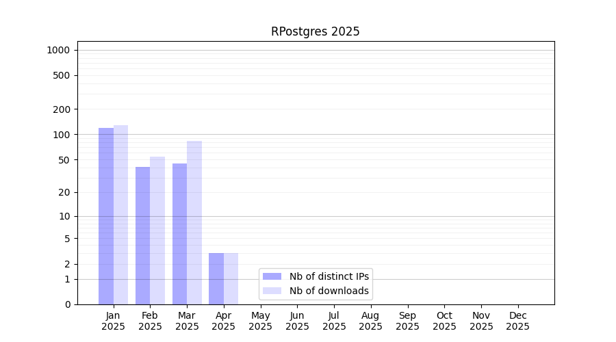 Number of downloads for experiment package RPostgres, year by year, from 2025 back to 2014 (years with no downloads are omitted):