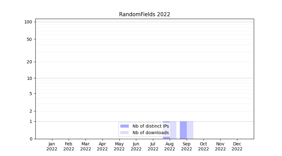 Number of downloads for experiment package RandomFields, year by year, from 2025 back to 2014 (years with no downloads are omitted):