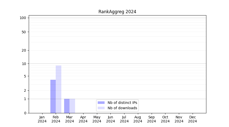 Number of downloads for experiment package RankAggreg, year by year, from 2025 back to 2014 (years with no downloads are omitted):