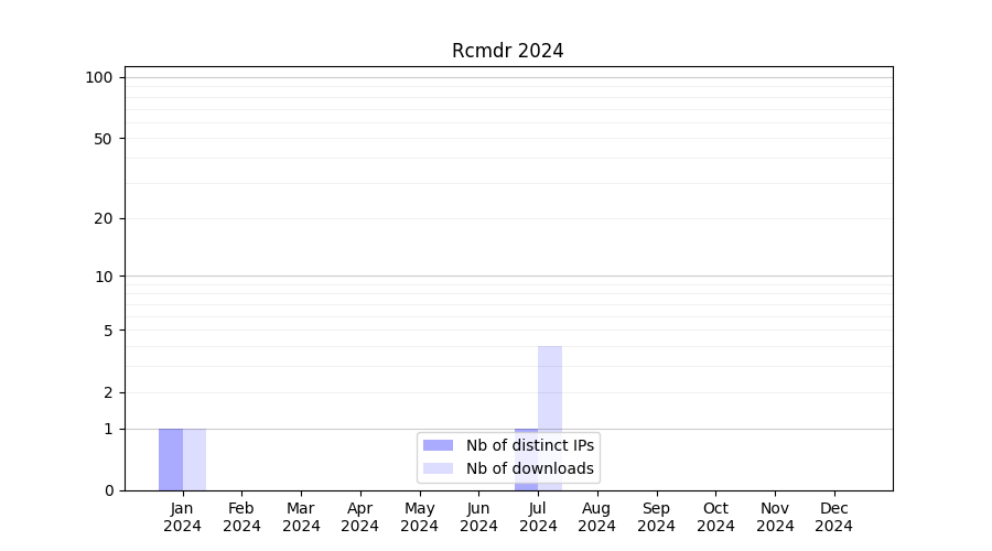 Number of downloads for experiment package Rcmdr, year by year, from 2025 back to 2014 (years with no downloads are omitted):