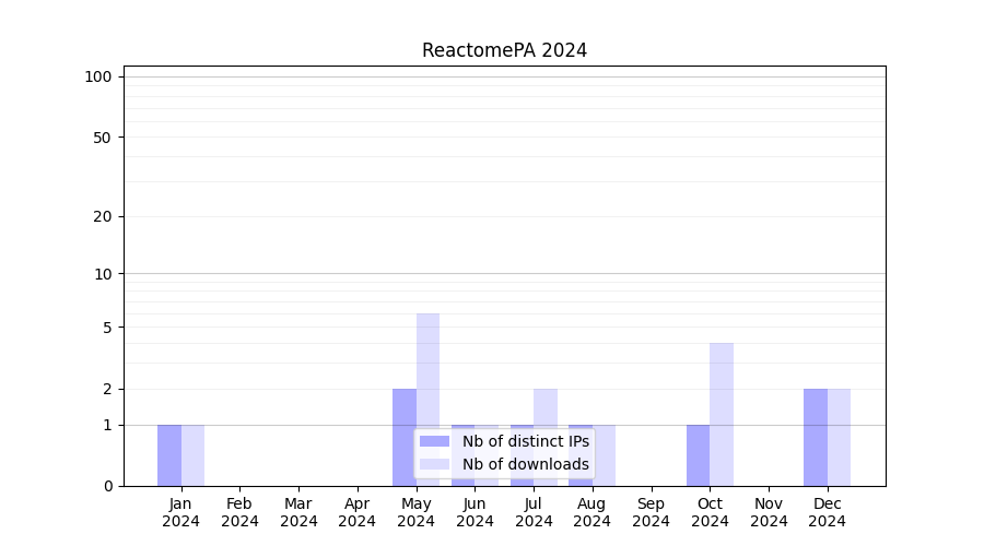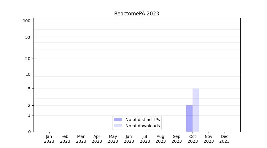Number of downloads for experiment package ReactomePA, year by year, from 2025 back to 2014 (years with no downloads are omitted):