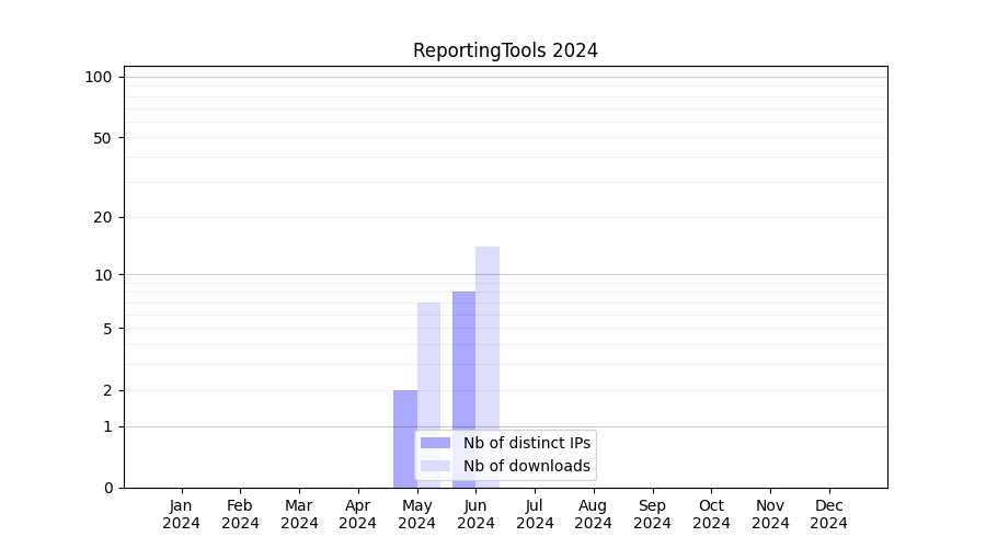 Number of downloads for experiment package ReportingTools, year by year, from 2025 back to 2014 (years with no downloads are omitted):
