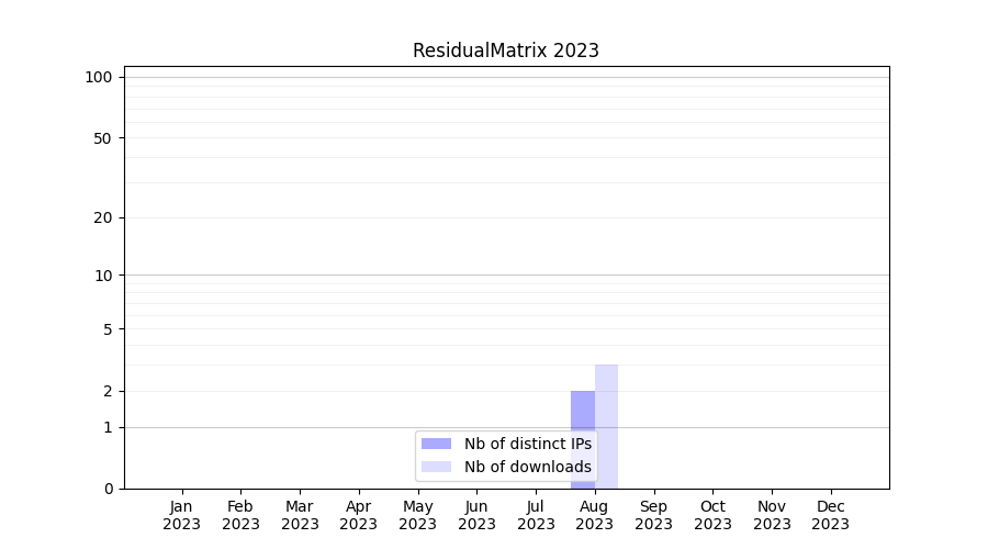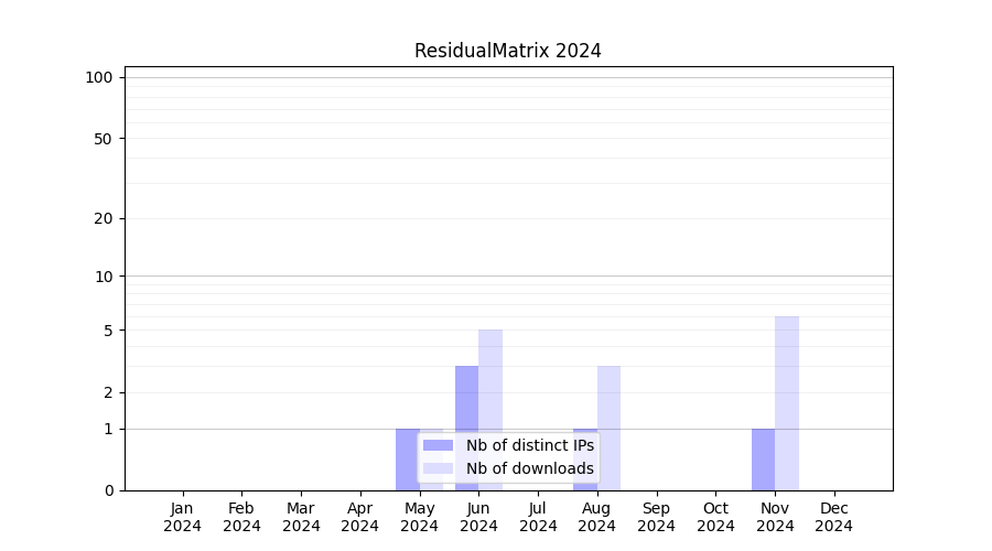 Number of downloads for experiment package ResidualMatrix, year by year, from 2025 back to 2014 (years with no downloads are omitted):