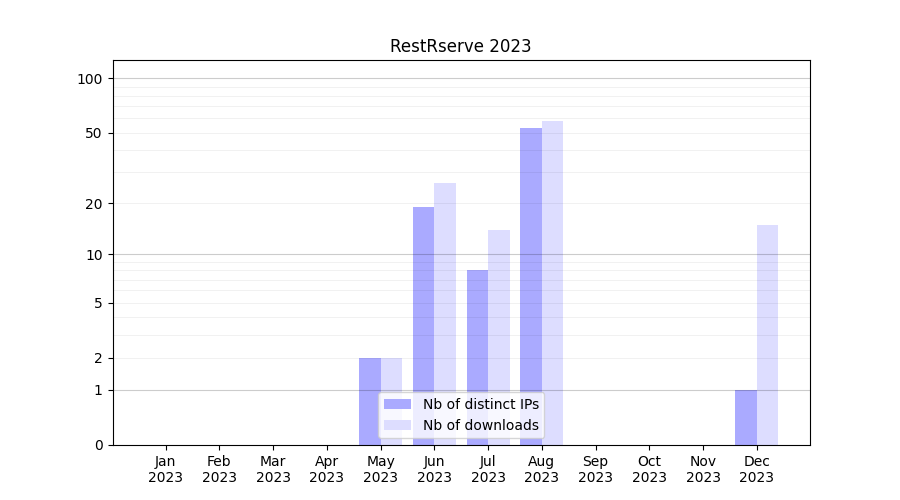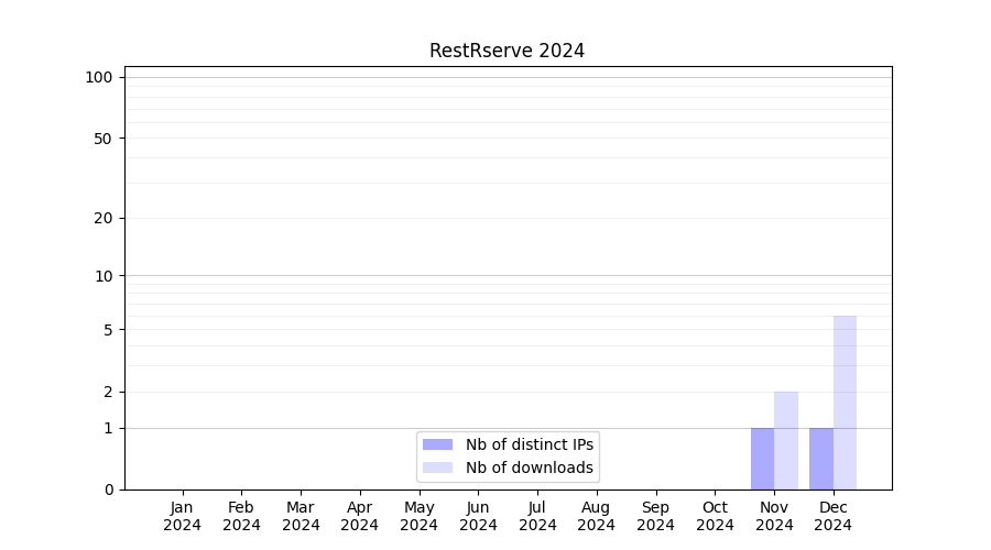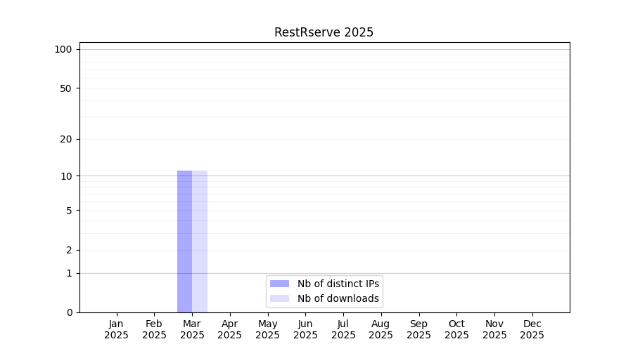 Number of downloads for experiment package RestRserve, year by year, from 2025 back to 2014 (years with no downloads are omitted):