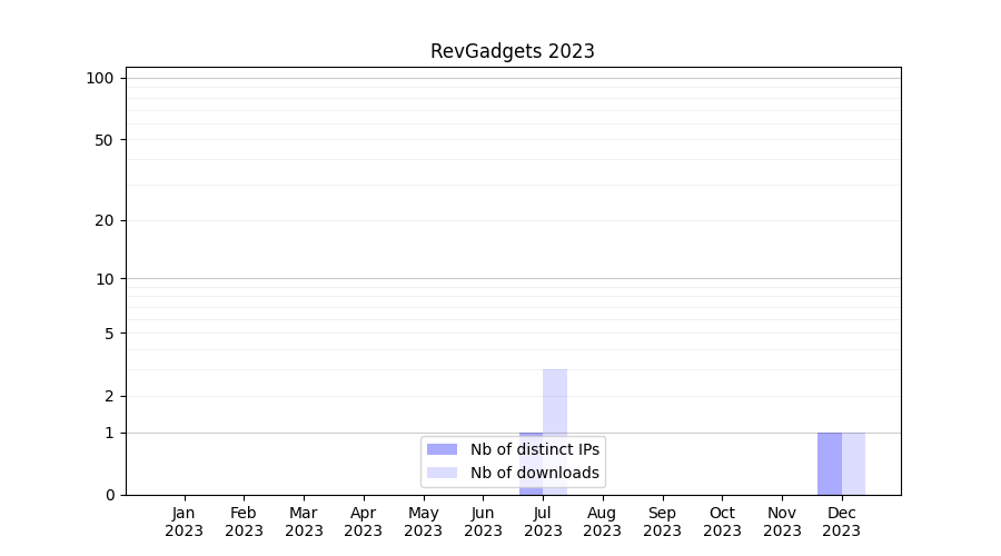 Number of downloads for experiment package RevGadgets, year by year, from 2025 back to 2014 (years with no downloads are omitted):