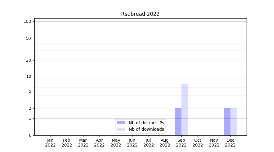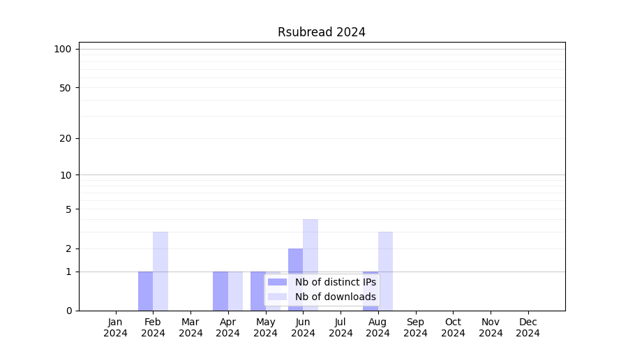 Number of downloads for experiment package Rsubread, year by year, from 2025 back to 2014 (years with no downloads are omitted):