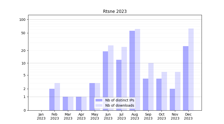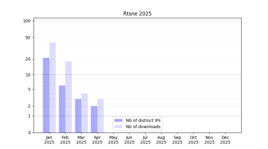 Number of downloads for experiment package Rtsne, year by year, from 2025 back to 2014 (years with no downloads are omitted):