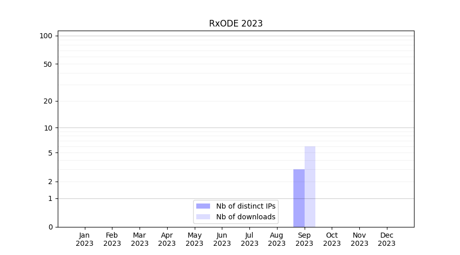 Number of downloads for experiment package RxODE, year by year, from 2025 back to 2014 (years with no downloads are omitted):