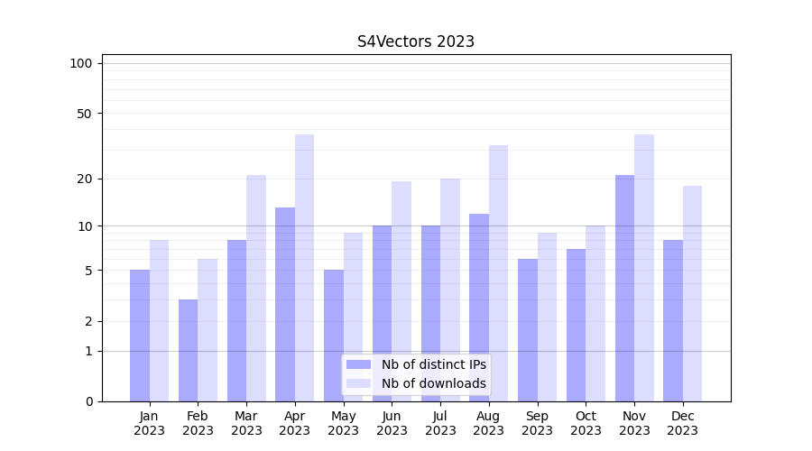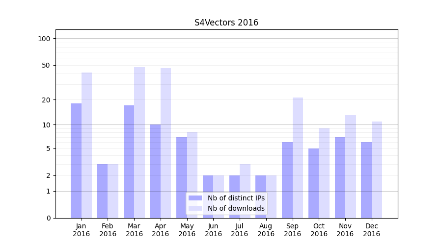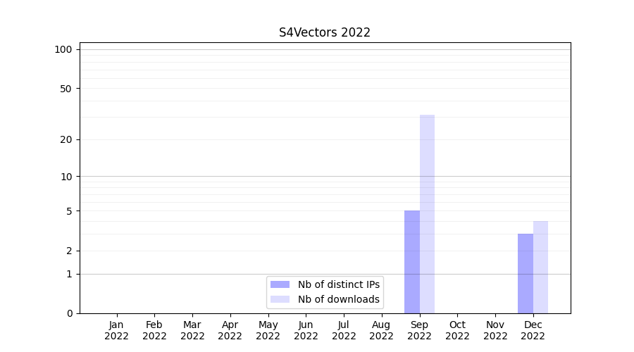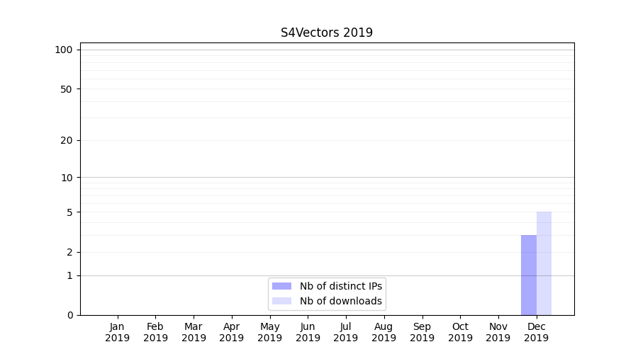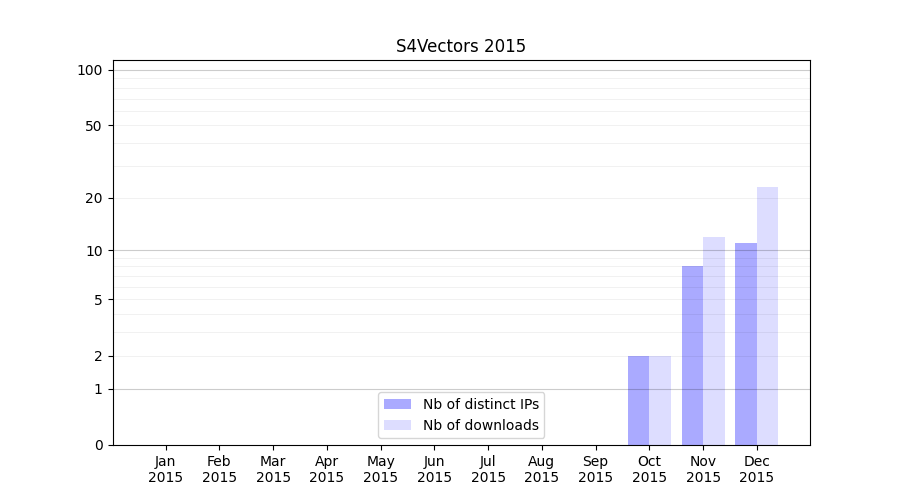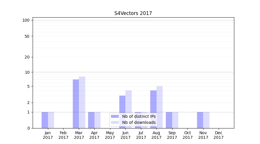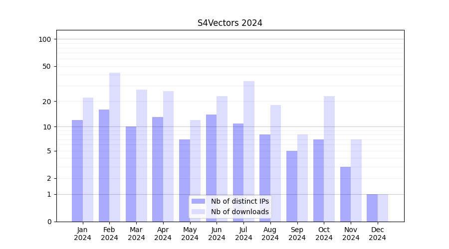 Number of downloads for experiment package S4Vectors, year by year, from 2025 back to 2014 (years with no downloads are omitted):