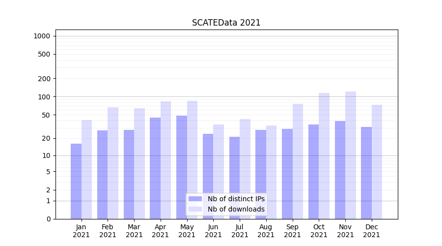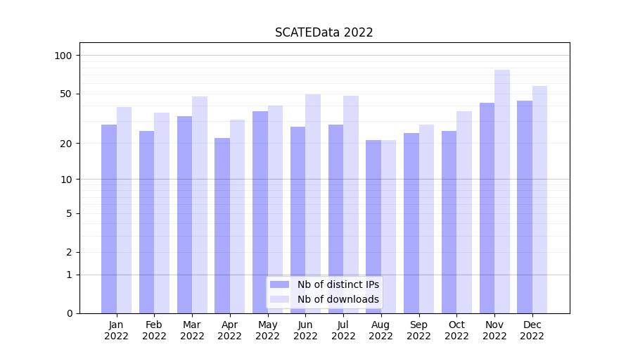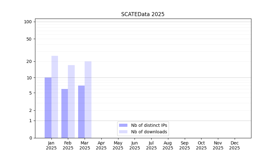 Number of downloads for experiment package SCATEData, year by year, from 2025 back to 2014 (years with no downloads are omitted):