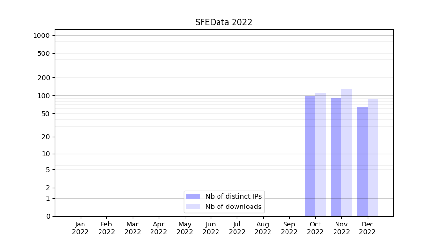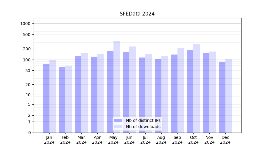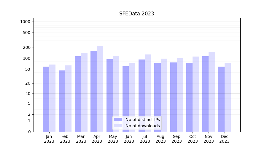 Number of downloads for experiment package SFEData, year by year, from 2025 back to 2014 (years with no downloads are omitted):