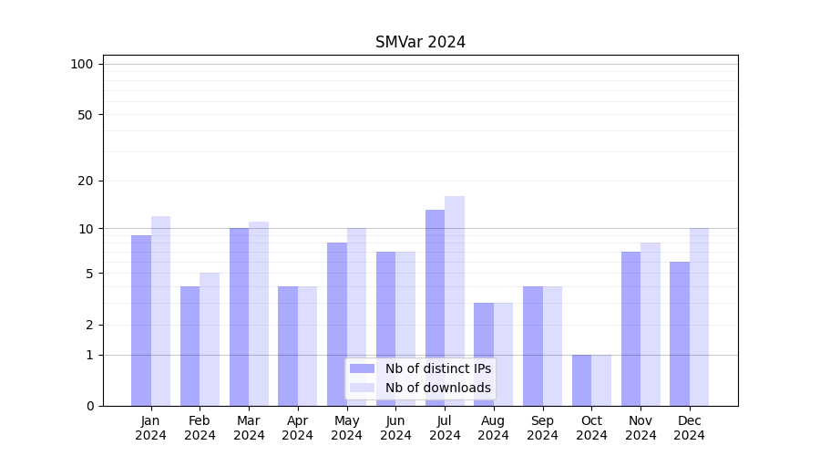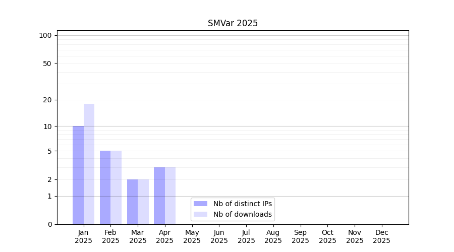 Number of downloads for experiment package SMVar, year by year, from 2025 back to 2014 (years with no downloads are omitted):