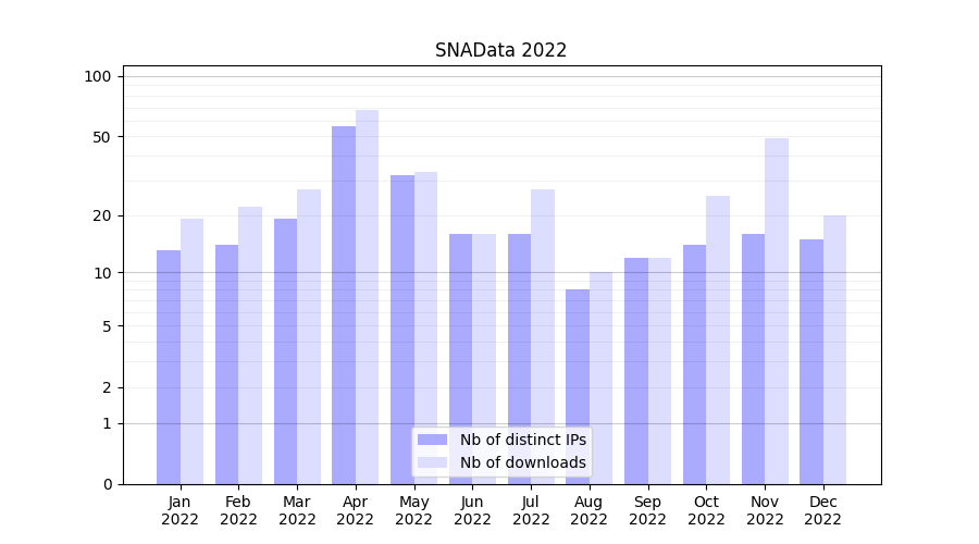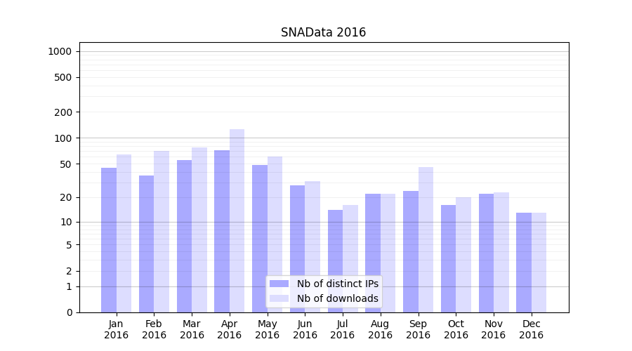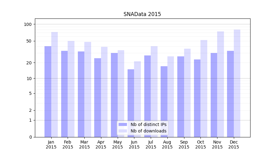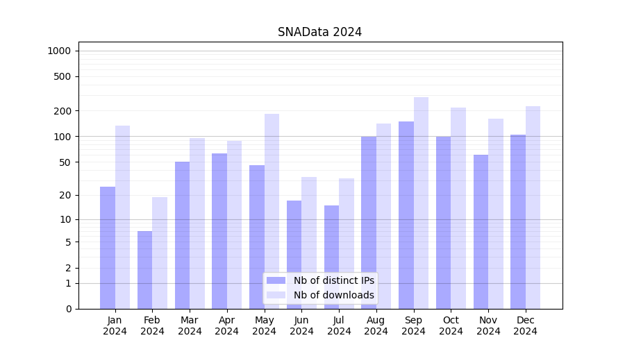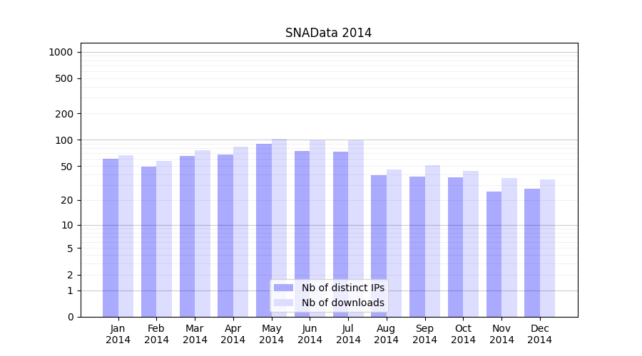 Number of downloads for experiment package SNAData, year by year, from 2025 back to 2014 (years with no downloads are omitted):