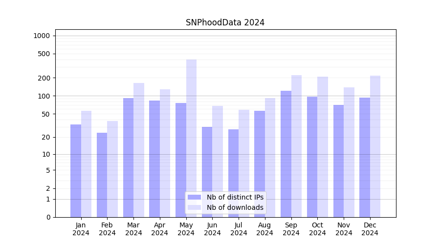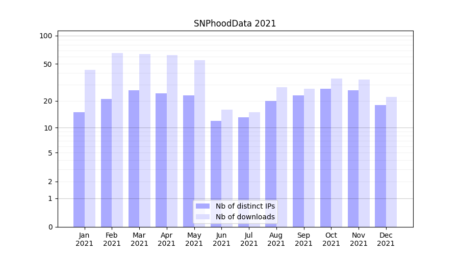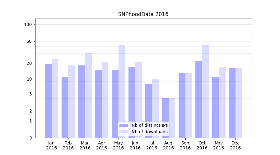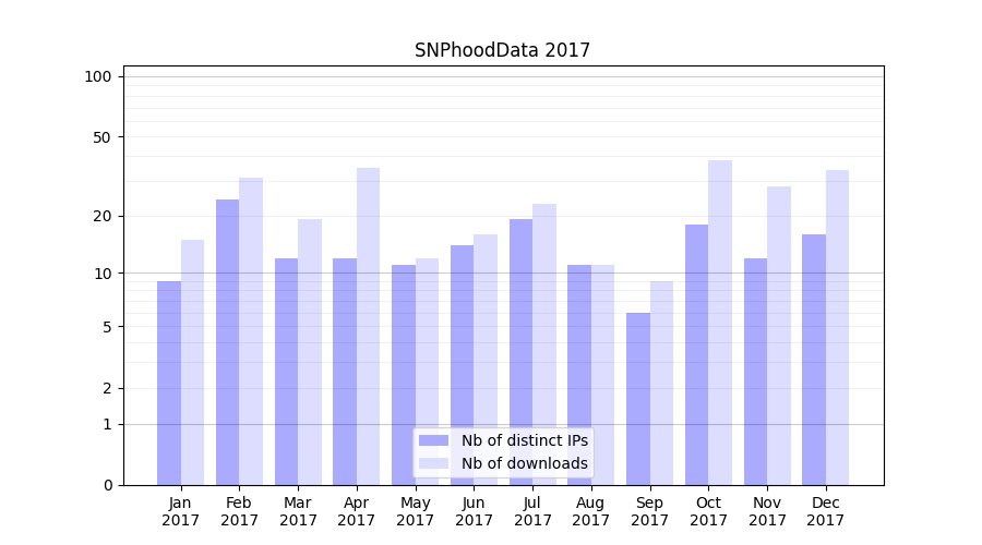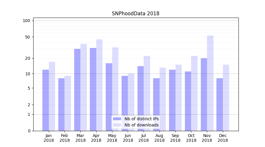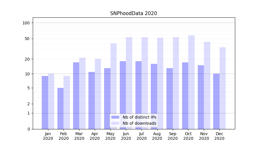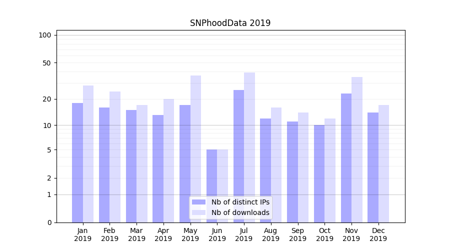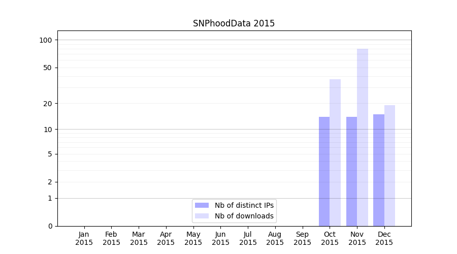 Number of downloads for experiment package SNPhoodData, year by year, from 2025 back to 2014 (years with no downloads are omitted):