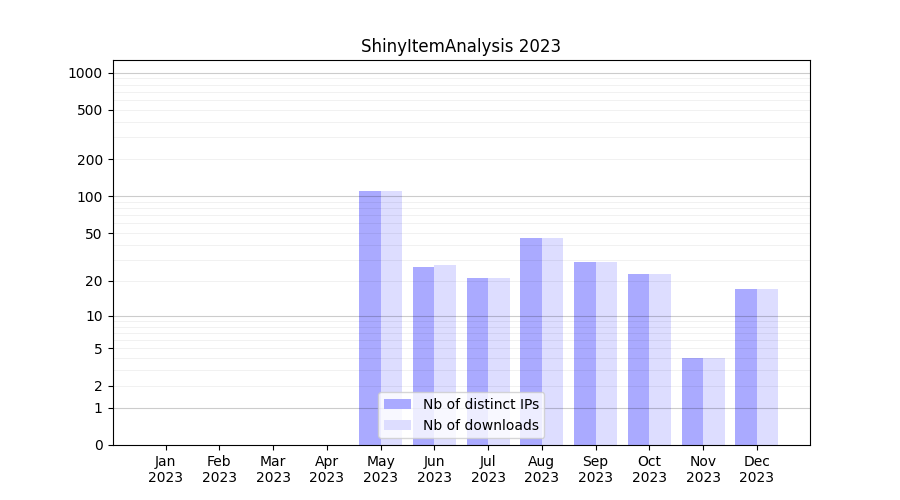 Number of downloads for experiment package ShinyItemAnalysis, year by year, from 2025 back to 2014 (years with no downloads are omitted):