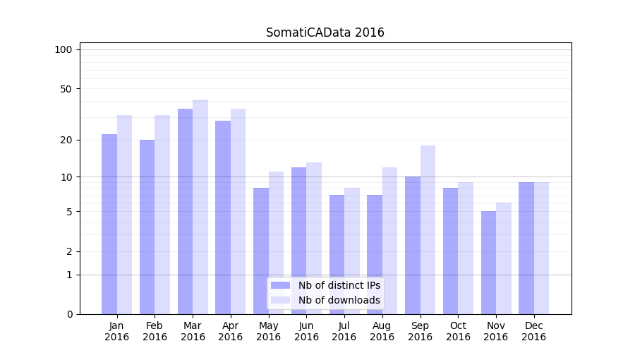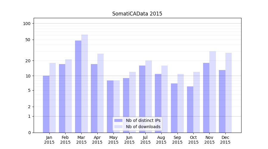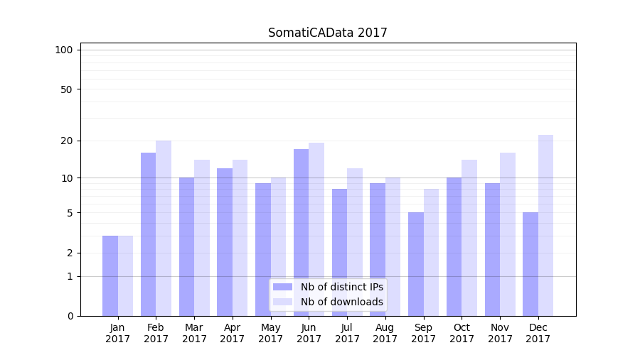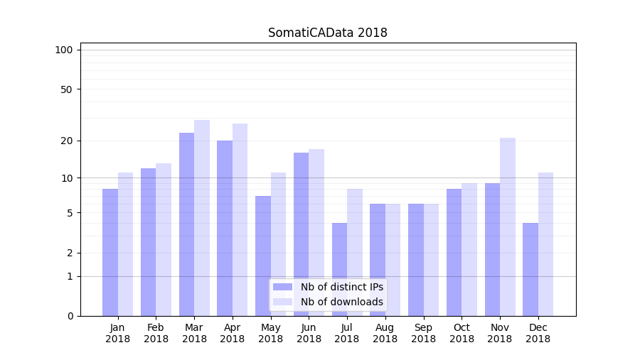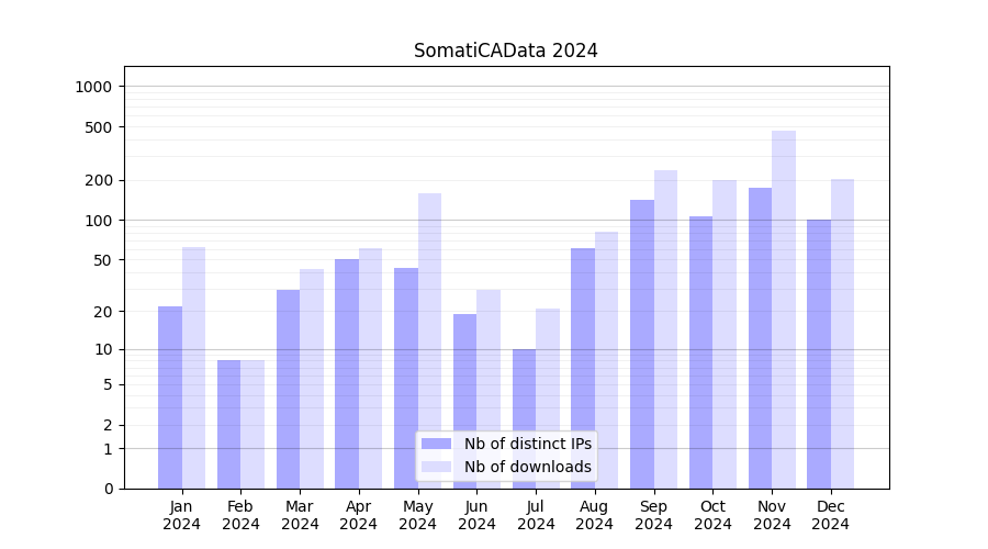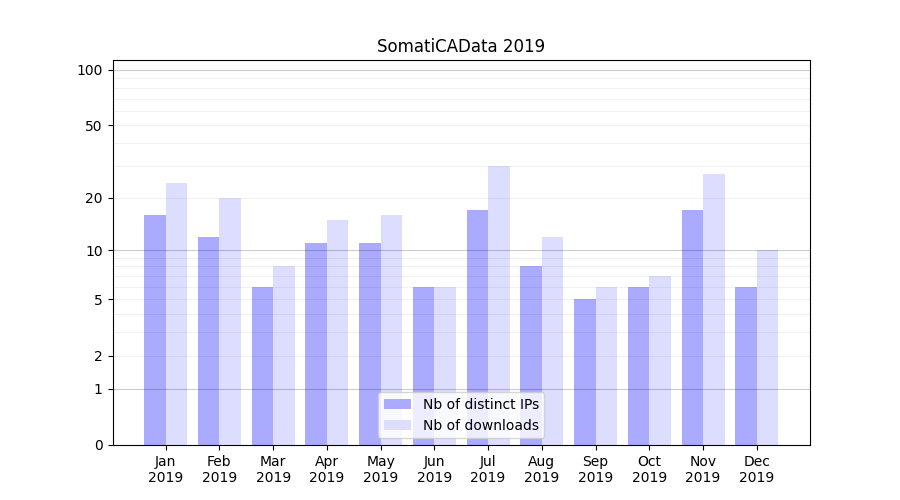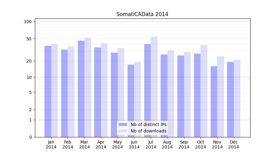 Number of downloads for experiment package SomatiCAData, year by year, from 2025 back to 2014 (years with no downloads are omitted):