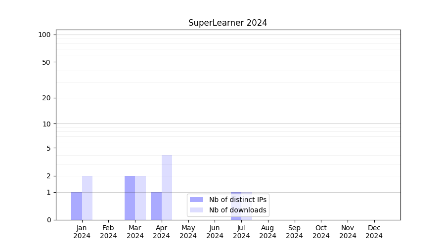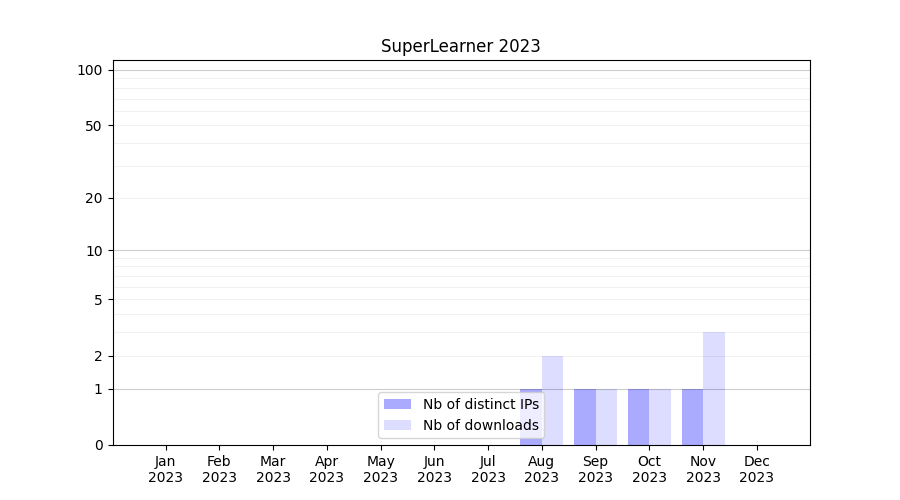 Number of downloads for experiment package SuperLearner, year by year, from 2025 back to 2014 (years with no downloads are omitted):