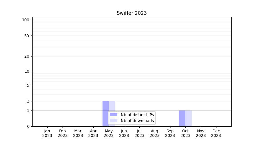 Number of downloads for experiment package Swiffer, year by year, from 2025 back to 2014 (years with no downloads are omitted):