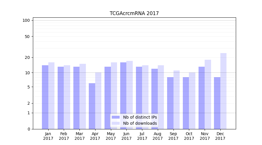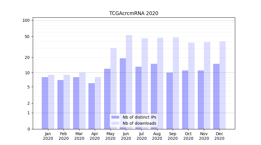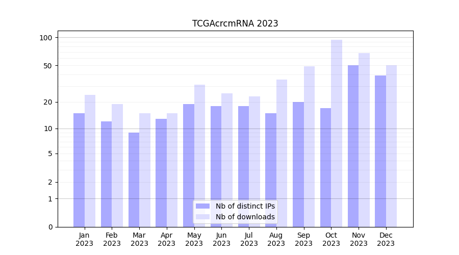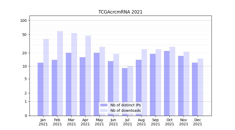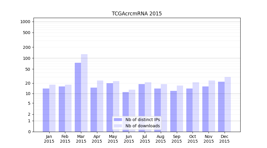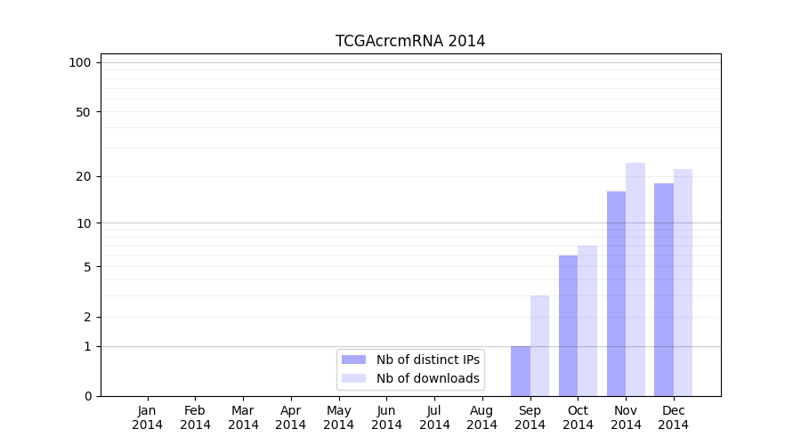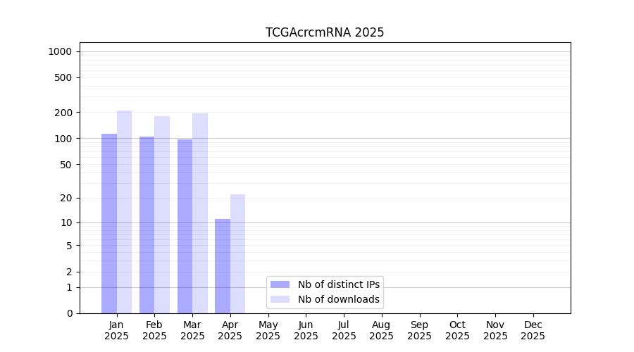 Number of downloads for experiment package TCGAcrcmRNA, year by year, from 2025 back to 2014 (years with no downloads are omitted):