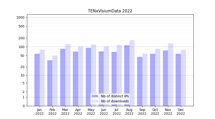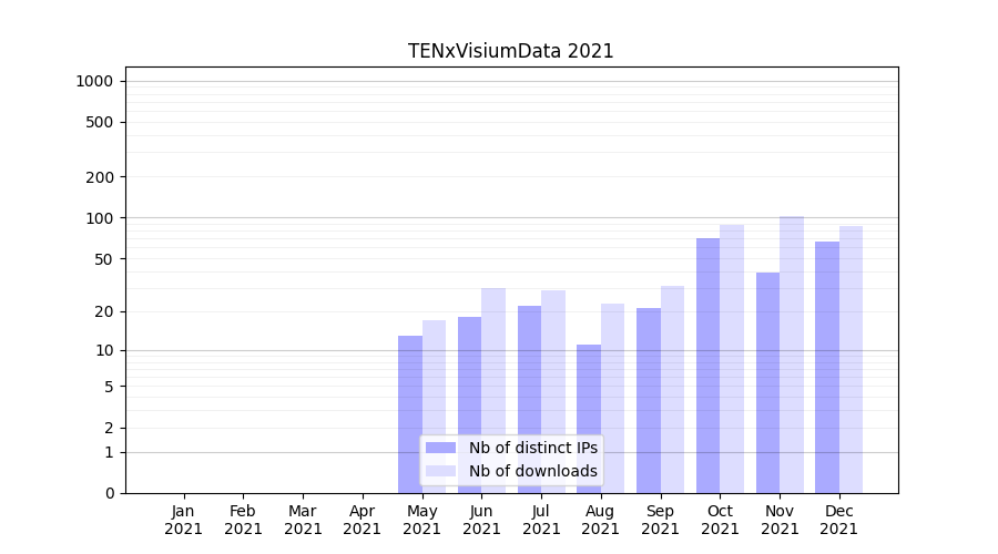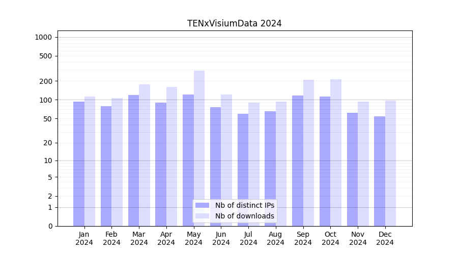 Number of downloads for experiment package TENxVisiumData, year by year, from 2025 back to 2014 (years with no downloads are omitted):