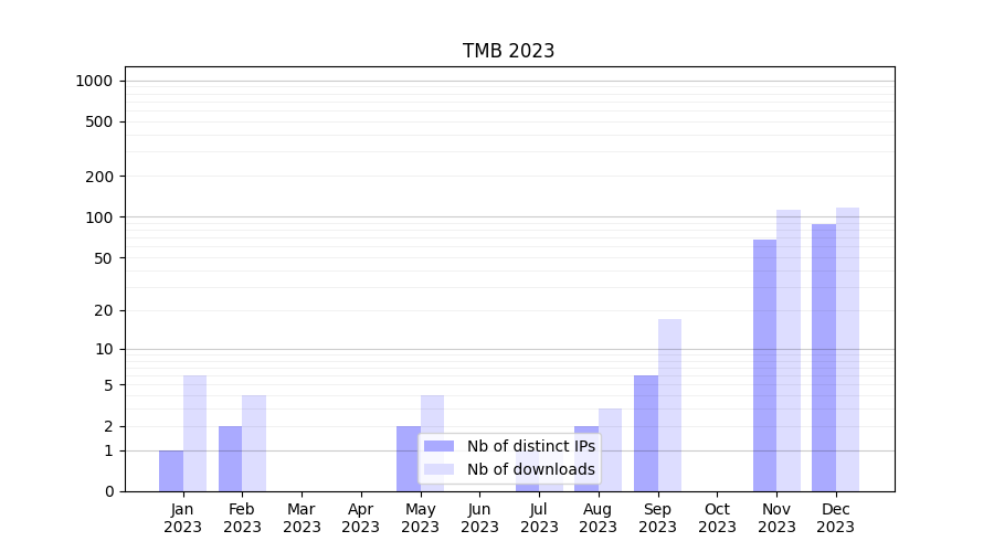 Number of downloads for experiment package TMB, year by year, from 2025 back to 2014 (years with no downloads are omitted):