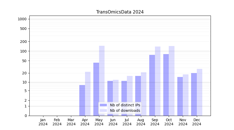 Number of downloads for experiment package TransOmicsData, year by year, from 2025 back to 2014 (years with no downloads are omitted):