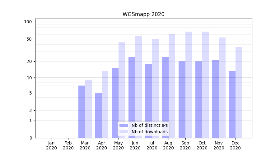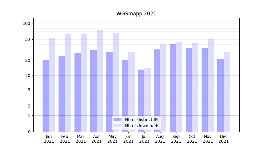 Number of downloads for experiment package WGSmapp, year by year, from 2025 back to 2014 (years with no downloads are omitted):