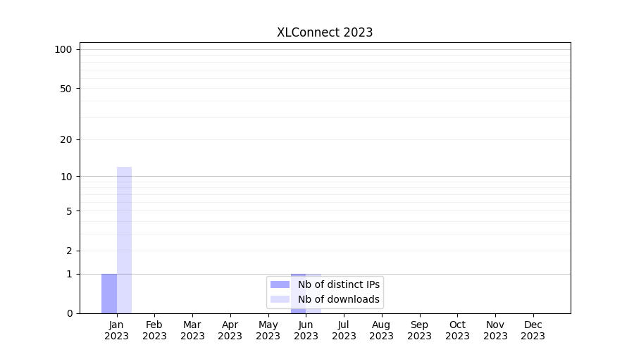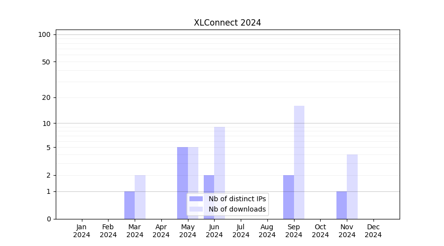 Number of downloads for experiment package XLConnect, year by year, from 2025 back to 2014 (years with no downloads are omitted):