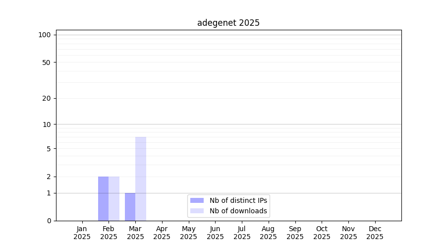 Number of downloads for experiment package adegenet, year by year, from 2025 back to 2014 (years with no downloads are omitted):