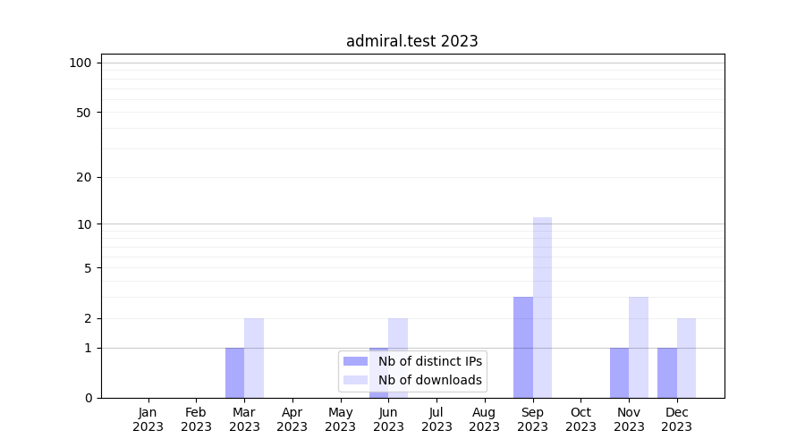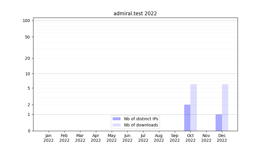 Number of downloads for experiment package admiral.test, year by year, from 2025 back to 2014 (years with no downloads are omitted):
