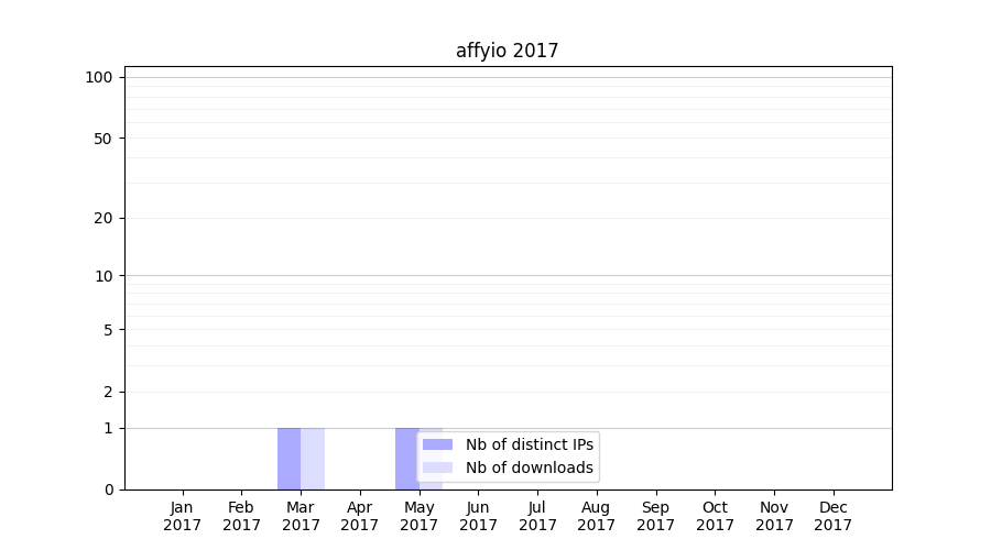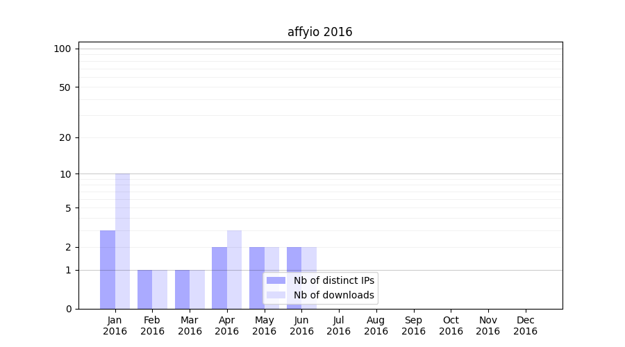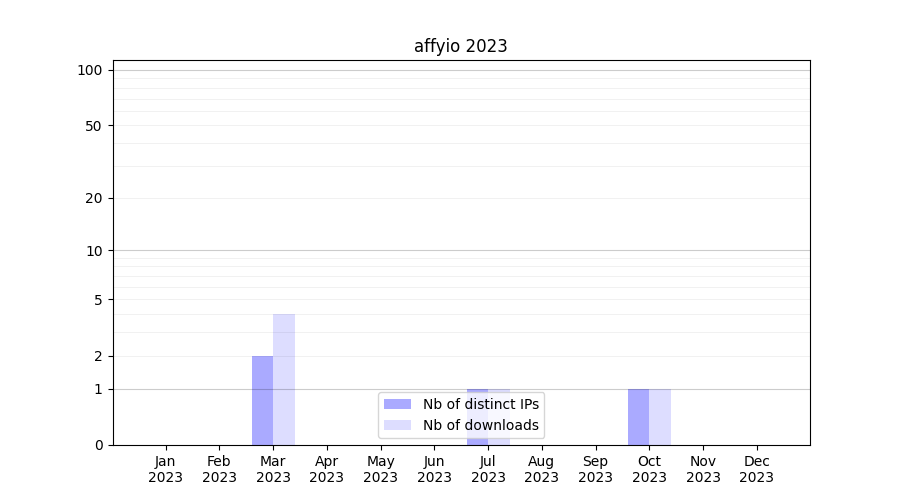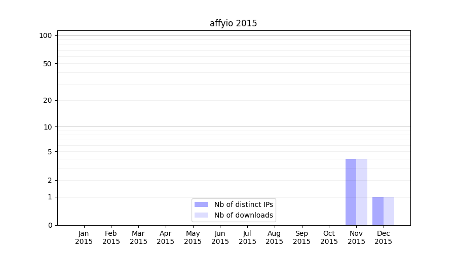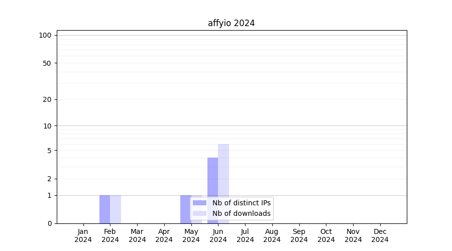Number of downloads for experiment package affyio, year by year, from 2025 back to 2014 (years with no downloads are omitted):
