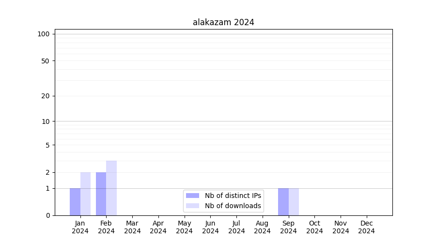 Number of downloads for experiment package alakazam, year by year, from 2025 back to 2014 (years with no downloads are omitted):