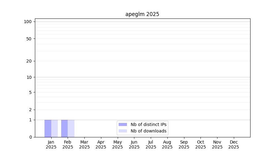 Number of downloads for experiment package apeglm, year by year, from 2025 back to 2014 (years with no downloads are omitted):