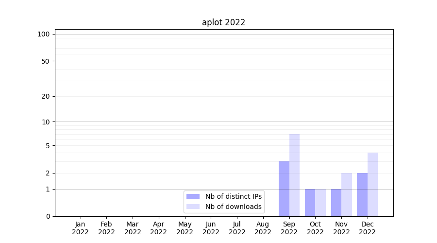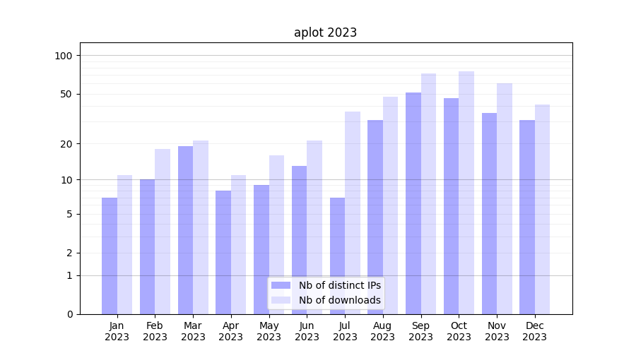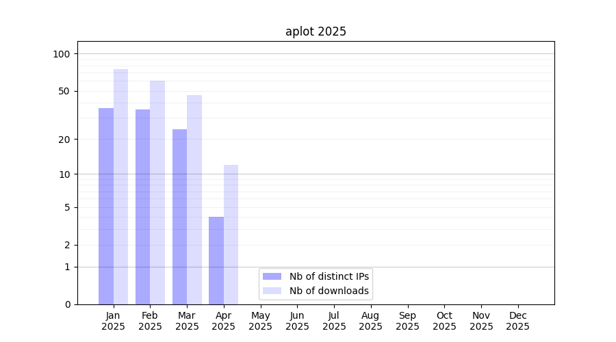 Number of downloads for experiment package aplot, year by year, from 2025 back to 2014 (years with no downloads are omitted):