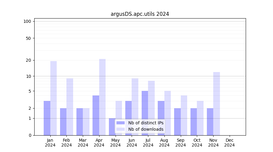 Number of downloads for experiment package argusDS.apc.utils, year by year, from 2025 back to 2014 (years with no downloads are omitted):